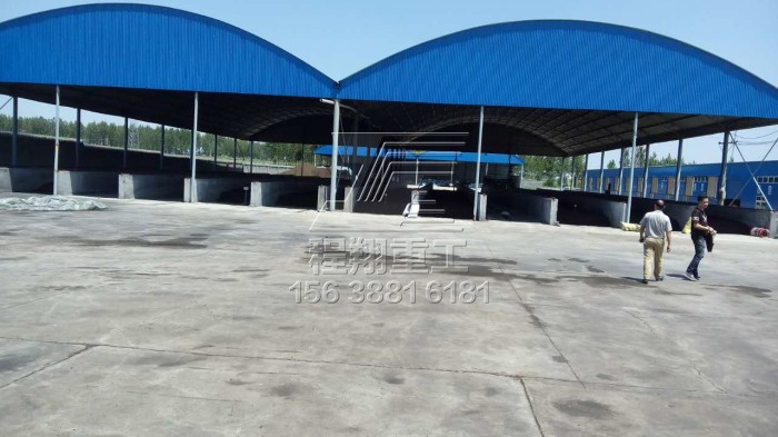 將水分調(diào)整合適的物料,通過布料車或鏟車鋪放在太陽能堆肥車間發(fā)酵槽內(nèi)。當(dāng)堆體高度較高時,可以利用液壓升降杠桿將翻拋齒輪升高,后期堆體面積減小,再回落至最低高度。發(fā)酵時可在表面撒上發(fā)酵菌劑有助于快速升溫和除臭,當(dāng)溫度達(dá)到一定程度時,槽式液壓翻堆機(jī)開始翻堆作業(yè),新鮮畜禽糞便從一側(cè)進(jìn)入槽子經(jīng)翻拋機(jī)不斷翻動,一個槽子內(nèi)翻拋結(jié)束移動到另一側(cè)槽子,一機(jī)多槽使用處理能力較強(qiáng)。從開始發(fā)酵到腐熟,夏天一半需7~15天左右,冬天需15~27天(主要以溫度和腐熟程度為基準(zhǔn))。