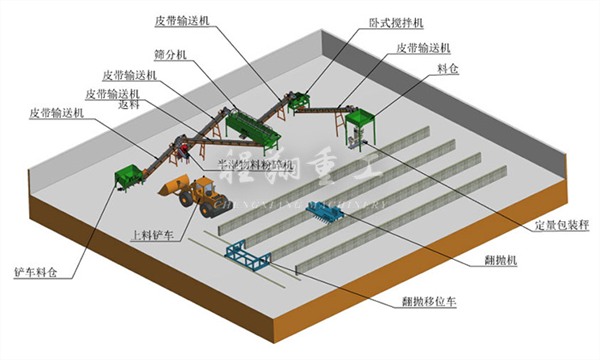 方案二:鏟車(chē)+翻堆機(jī)+皮帶輸送機(jī)+篩分機(jī)+破碎機(jī)