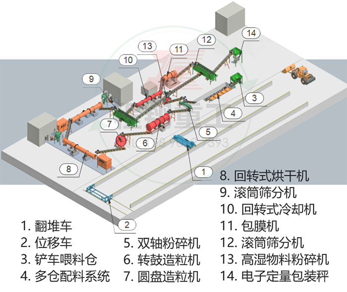 查看 > 20 2020/11由于該豬糞秸稈有機肥料生產(chǎn)線產(chǎn)量較大,因此分為多車裝置運輸。主要的豬糞加工設(shè)備有:大型秸稈粉碎機、履帶式翻堆機、臥式攪拌機、新型三合一造粒機、不同型號的滾筒篩分機以及多個型號的烘干冷卻設(shè)備。滾筒烘干設(shè)備風(fēng)頭以及風(fēng)機安置熱風(fēng)爐以及冷卻設(shè)備多個烘干冷卻設(shè)備履帶式翻堆機以及大型秸稈粉碎機二次烘干設(shè)備滾筒篩分機以及鏟車喂料倉本次豬糞秸稈有機肥料生產(chǎn)線工藝設(shè)計流程為:利用大型秸稈粉碎機將稻草秸稈等粉碎均勻,