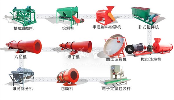 生產(chǎn)復混肥主要包含兩個環(huán)節(jié):發(fā)酵及造粒。發(fā)酵期間主要借助有機肥槽式翻堆機以及有機肥粉碎設備,后期造粒環(huán)節(jié)主要有臥式攪拌機、濕法造粒機、滾筒篩分機以及包裝秤等等,有需要的可以添一些常用的有機肥加工配套設備:滾筒烘干機、冷卻機、以及包膜機等等。