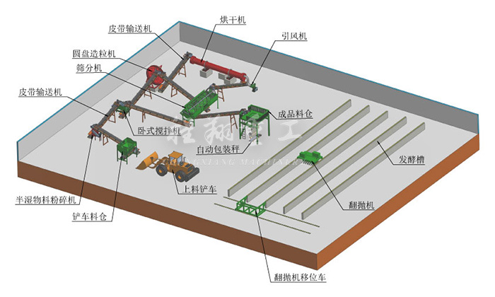 本次牛糞全套有機(jī)肥料設(shè)備生產(chǎn)工藝采用槽式好氧發(fā)酵,利用翻堆槽發(fā)酵既干凈又能最大化的利用有限的場地,增加糞便處理量。由于客戶對于顆粒有機(jī)質(zhì)含量以及NPK有特殊要求,因此我們?yōu)榭蛻魧iT定制了一臺三倉的靜態(tài)配料系統(tǒng)。